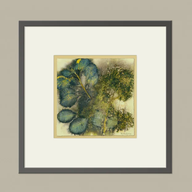 Ecoprint van het blad en de bloesem van de vrouwenmantel (Alchemilla mollis) op hoogwaardig aquarelpapier van 100% katoen. Uniek werk, professioneel ingelijst.