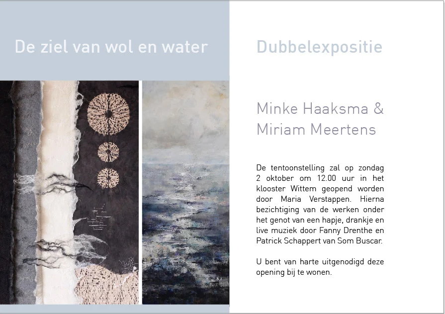 Op zondag 2 oktober zal de dubbel expositie ´De ziel van wol en water´ geopend worden. Ik zal hier viltwerken en ecoprints tonen samen met Miriam Meertens die prachtige zeezichten schildert.